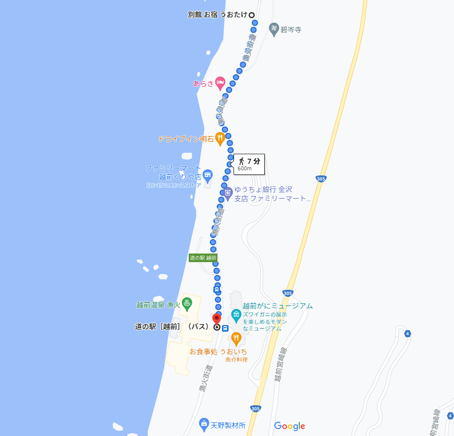 道の駅から宿まで歩いて7分、距離600mほどです。