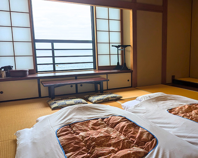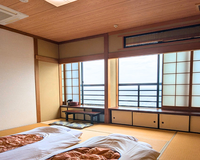 海を望む、落ち着いた和室の温泉宿。