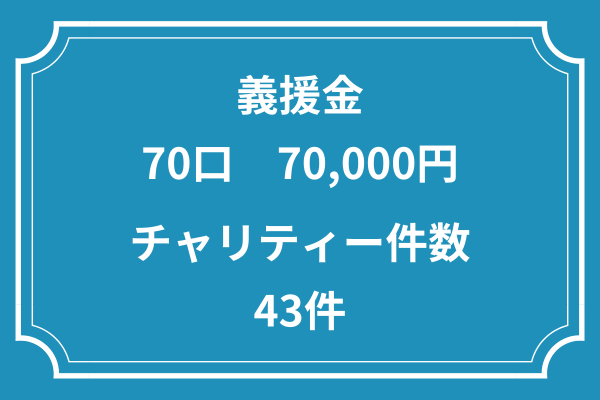 チャリティー件数 43件 義援金集計 69,187.96 1000円以下は繰り上げといたしました。