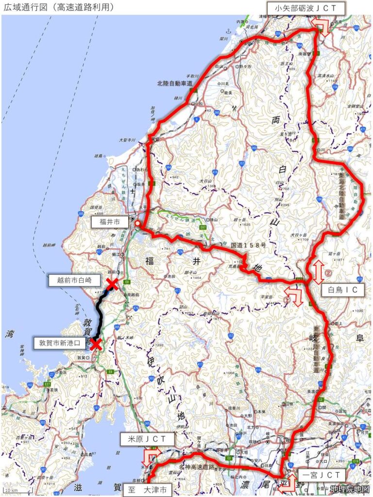 一宮JCTから東海北陸道、白鳥ICから国道158号で福井市までの道程になります。